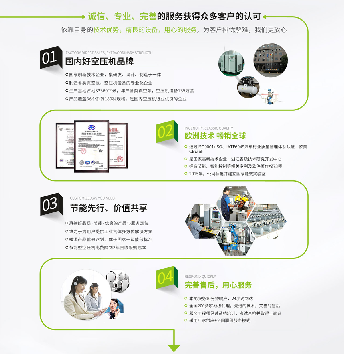 浙江盛源空壓機制造有限公司是一家研究制造無油真空泵系列、新能源電動空壓機、空氣壓縮機設(shè)備、器材、永磁伺服電機、工業(yè)投資等多元化經(jīng)營的大型企業(yè),是國家高新技術(shù)企業(yè),浙江省級技術(shù)研究開發(fā)中心。